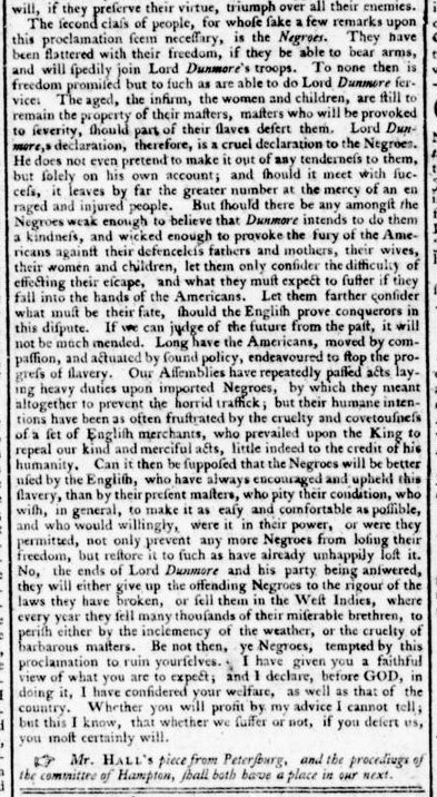 The second class of people, for whose sake a few remarks upon this proclamation seem necessary, is the Negroes. They have been flattered with their freedom, if they be able to bear arms, and will spedily join Lord Dunmore's troops. To none then is freedom promised but to such as are able to do Lord Dunmore service: The aged, the infirm, the women and children, are still to remain the property of their masters, masters who will be provoked to severity, should part of their slaves desert them. Lord Dunmore's declaration, therefore, is a cruel declaration to the Negroes. He does not even pretend to make it out of any tenderness to them, but solely on his own account; and should it meet with success, it leaves by far the greater number at the mercy of an enraged and injured people. But should there be any amongst the Negroes weak enough to believe that Dunmore intends to do them a kindness, and wicked enough to provoke the fury of the Americans against their defenceless fathers and mothers, their wives, their women and children, let them only consider the difficulty of effecting their escape, and what they must expect to suffer if they fall into the hands of the Americans. Let them farther consider what must be their fate, should the English prove conquerors in this dispute. If we can judge of the future from the past, it will not be much mended. Long have the Americans, moved by compassion, and actuated by sound policy, endeavoured to stop the progress of slavery. Our Assemblies have repeatedly passed acts laying heavy duties upon imported Negroes, by which they meant altogether to prevent the horrid traffick; but their humane intentions have been as often frustrated by the cruelty and covetousness of a set of English merchants, who prevailed upon the King to repeal our kind and merciful acts, little indeed to the credit of his humanity. Can it then be supposed that the Negroes will be better used by the English, who have always encouraged and upheld this slavery, than by their present masters, who pity their condition, who wish, in general, to make is as easy and comfortable as possible, and who would willingly, were it in their power, or were they permitted, not only prevent any more Negroes from losing their freedom, but restore it to such as have already unhappily lost it. No, the ends of Lord Dunmore and his party being answered, they will either give up the offending Negroes to the rigour of the laws they have broken, or sell them in the West Indies, where every year they sell many thousands of their miserable brethren, to perish either by the inclemency of the weather, or the cruelty of barbarous masters. Be not then, ye Negroes, tempted by this proclamation to ruin yourselves. I have given you a faithful view of what you are to expect; and I declare, before GOD, in doing it, I have considered your welfare, as well as that of the country. Whether you will profit by my advice I cannot tell; but this I know, that whether we suffer or not, if you desert us, you most certainly will.